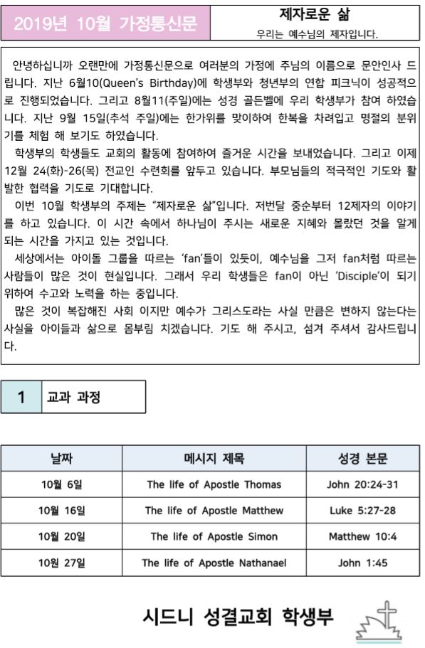 | 2019년 10월 가정통신문 : 제자로운 삶 | 손효진 전도사 | 2019-10-16 | |||